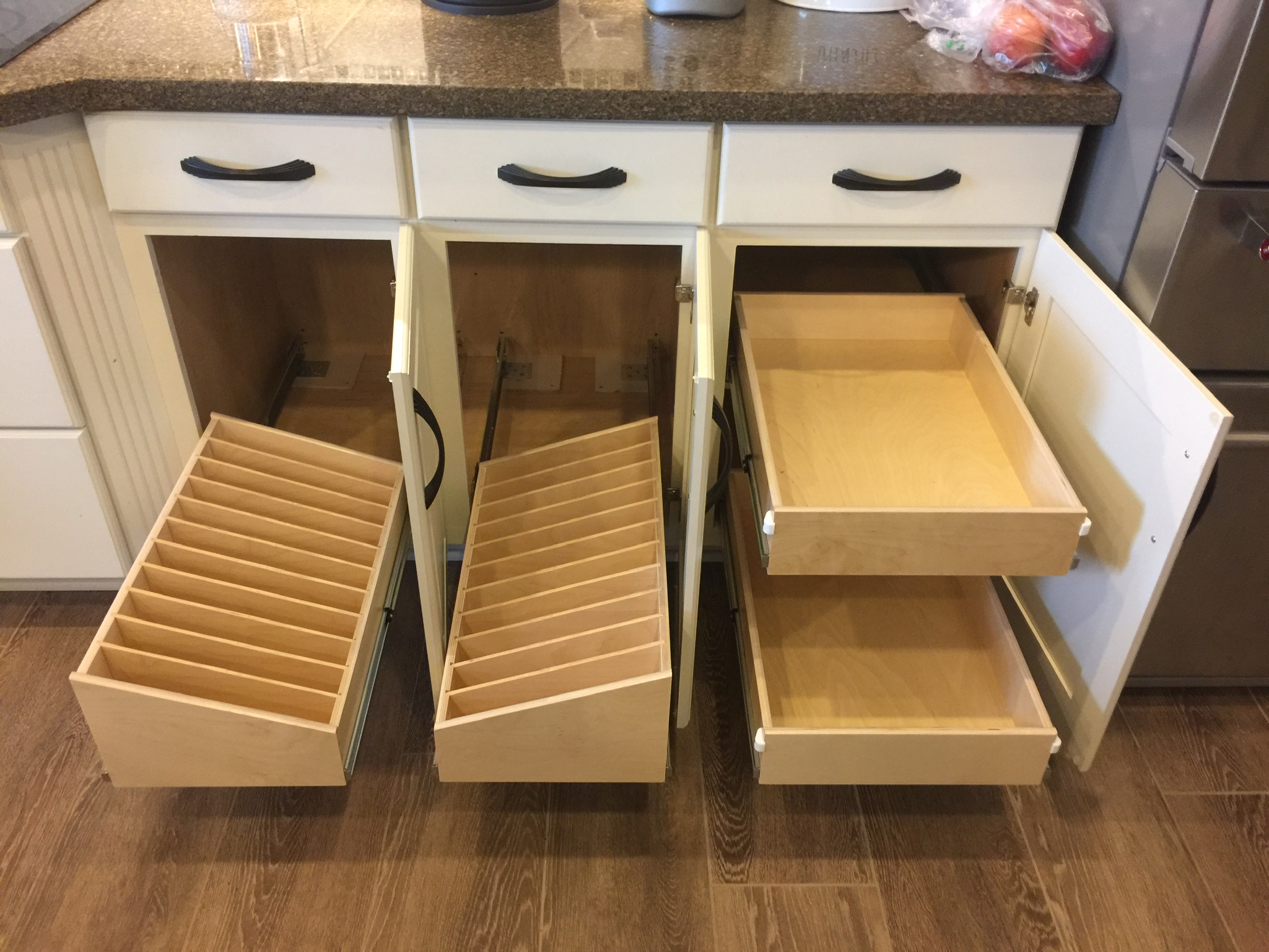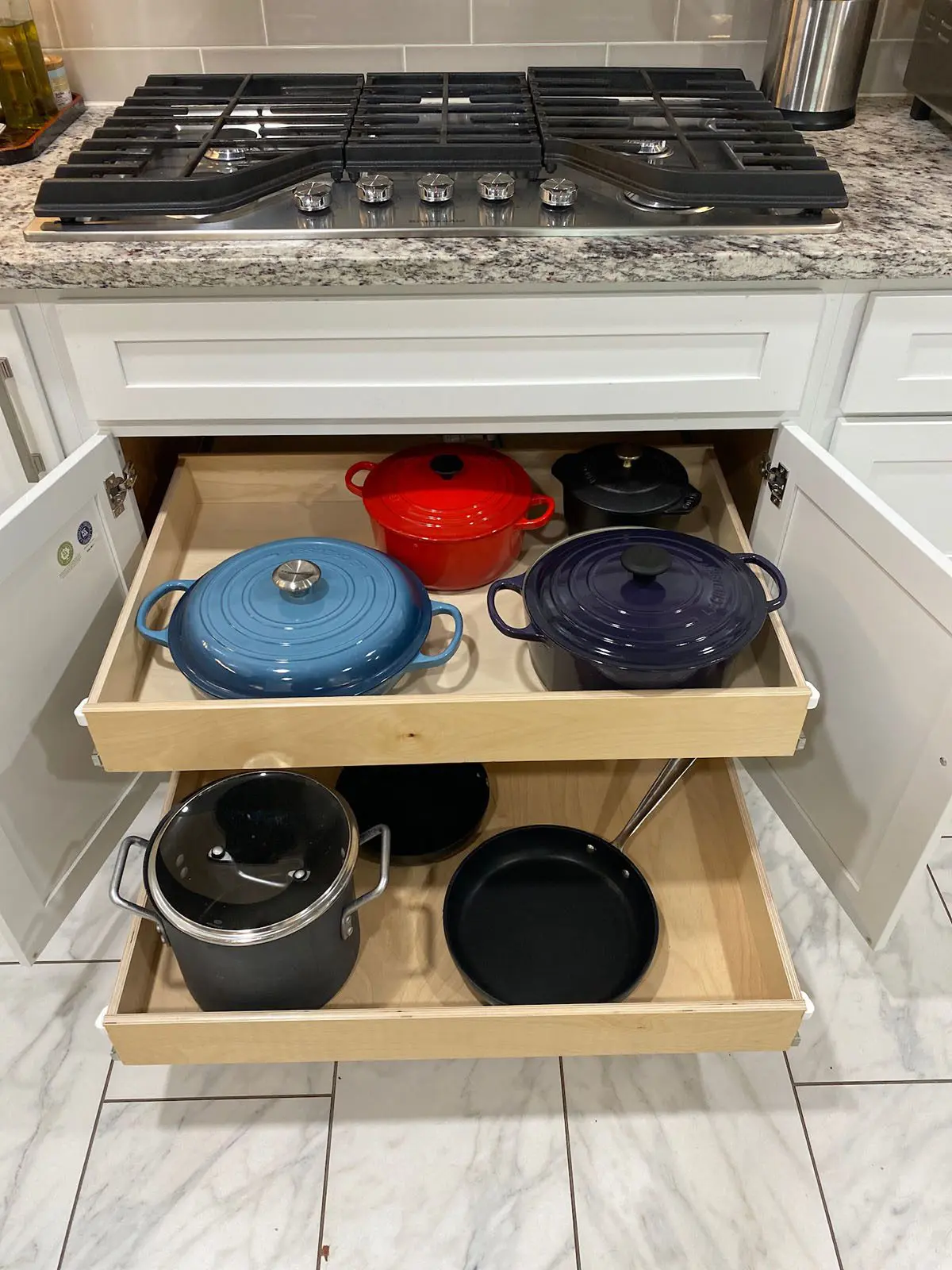Custom pull-out shelves in Dallas and Fort Worth, TX for your existing cabinets—more storage, less bending, and installed in weeks, not months. Every item in your kitchen can become visible by simply pulling out your glide-out shelves!